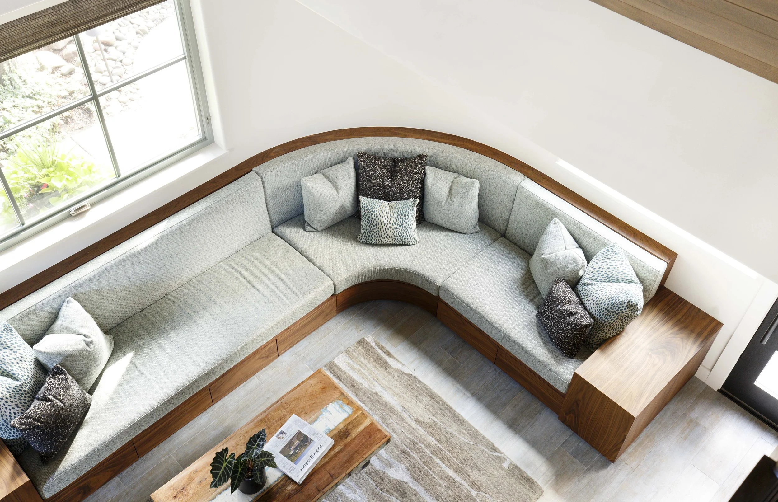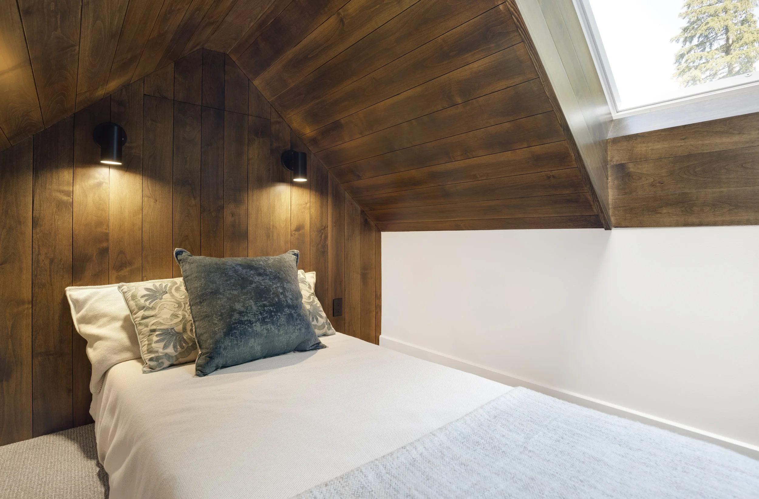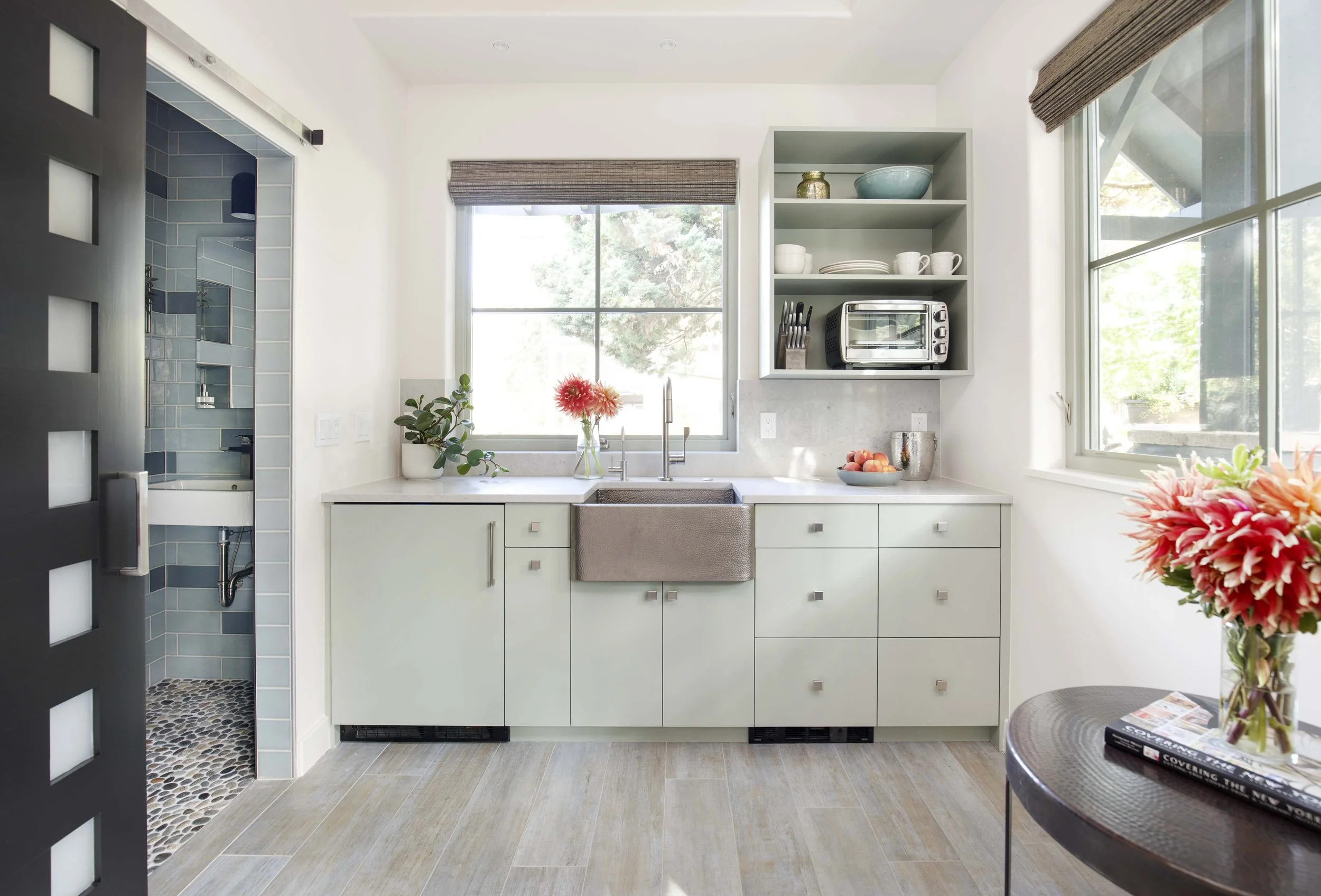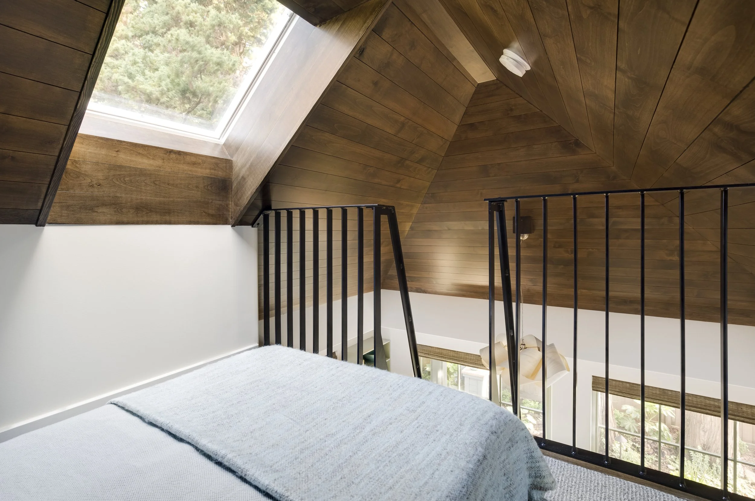 When this couple relocated from California to this 1990’s modern home on a canal in Lake Oswego, they wanted to create a unique space for hosting friends and guests. They hired Gusto to redesign a portion of their three-car garage into a guest suite and party room. The existing curved wall offered the perfect backdrop for a 15-foot-long custom bench with storage below. The tall, vaulted ceilings allowed space for a lofted sleeping area over the ceiling of the bathroom, accessed by a custom steel ladder. The kitchenette includes all the amenities needed for a comfortable short-term stay.