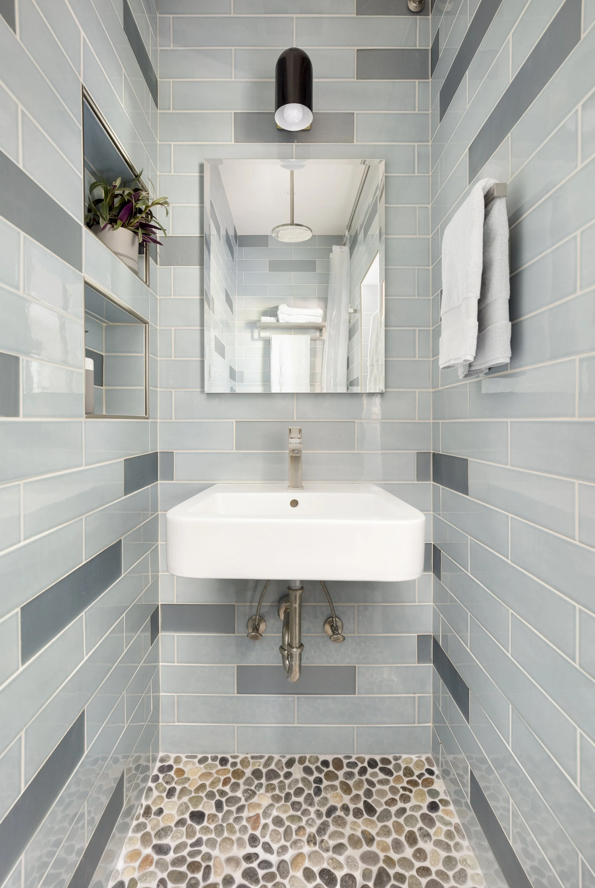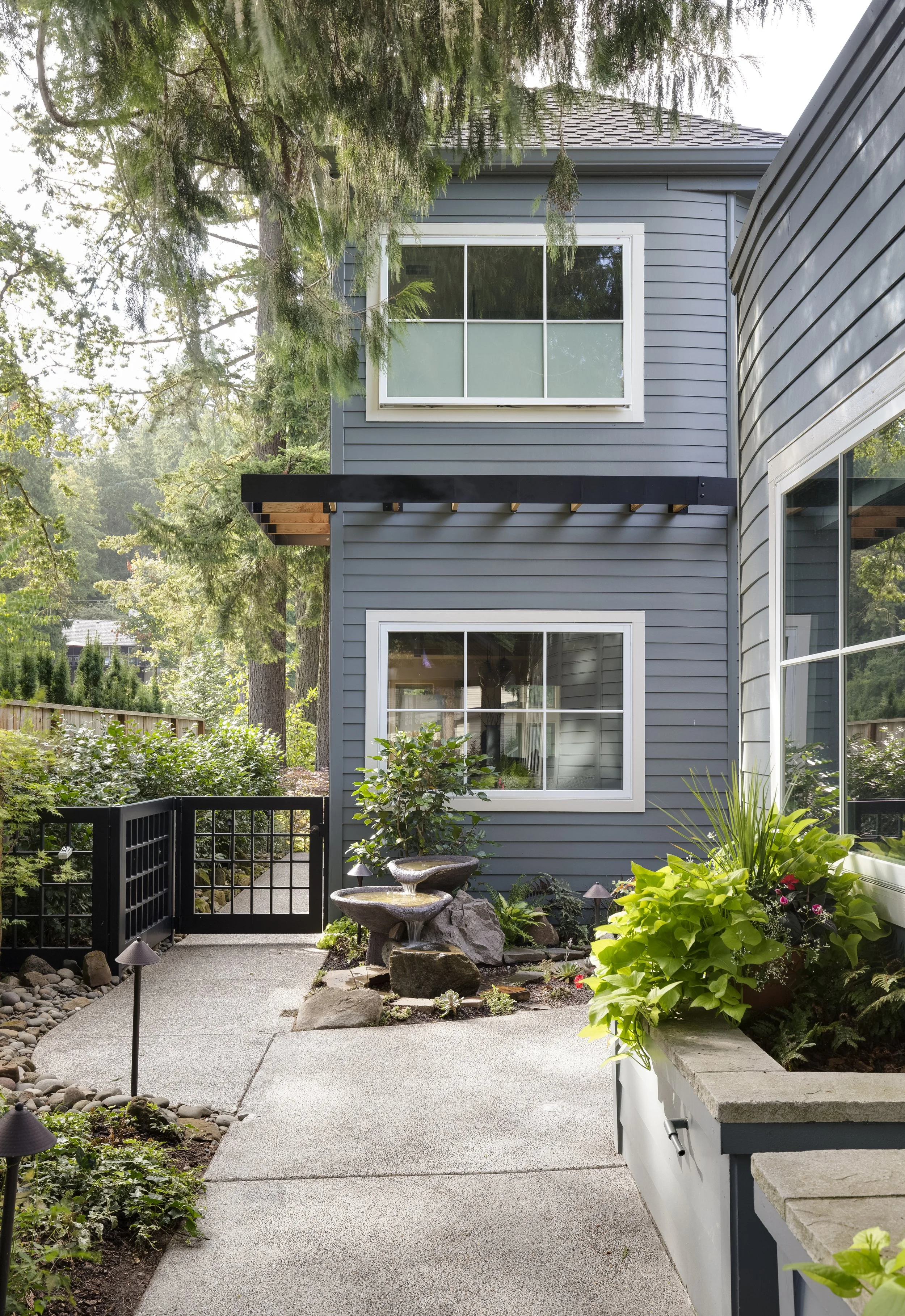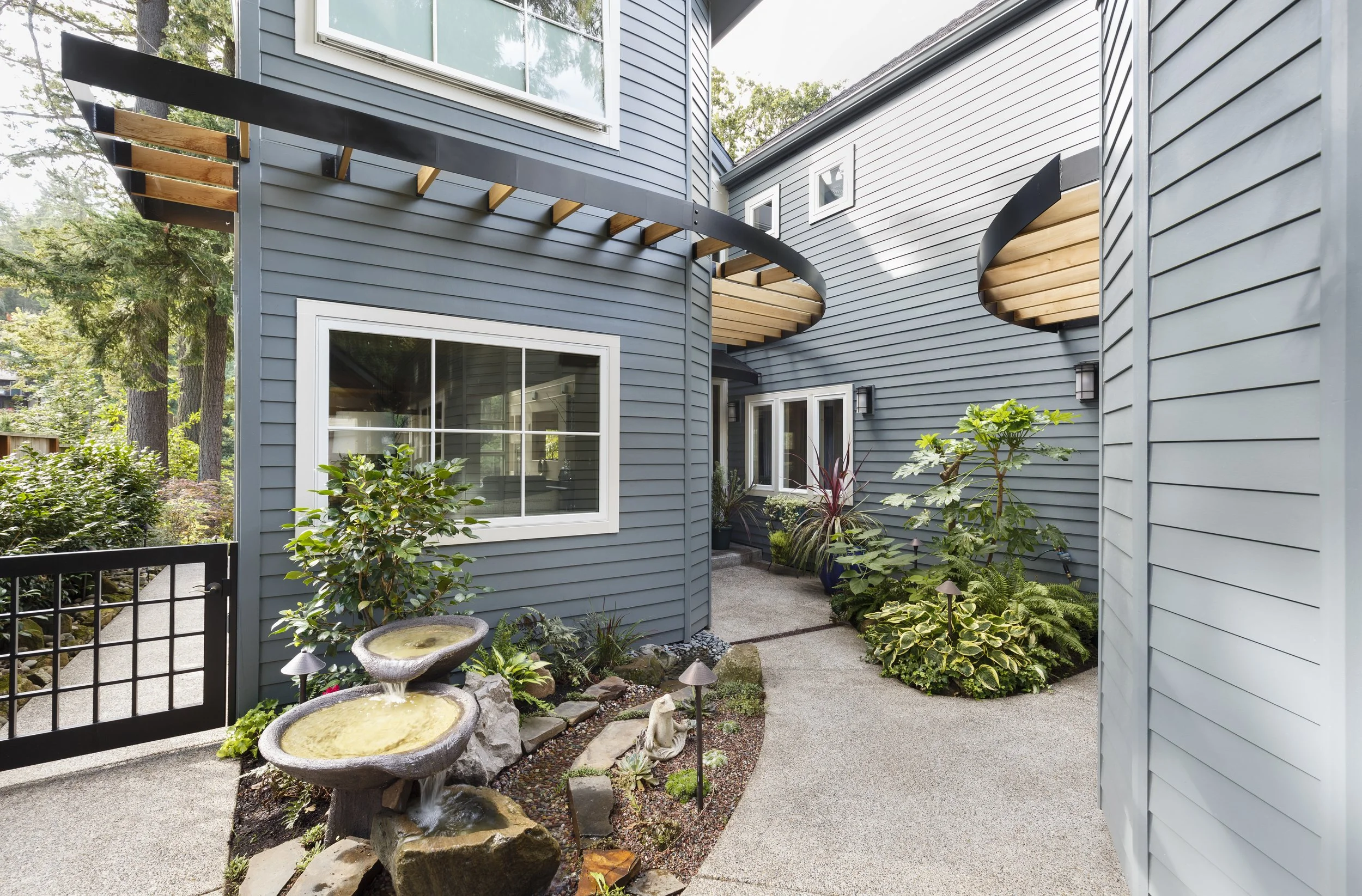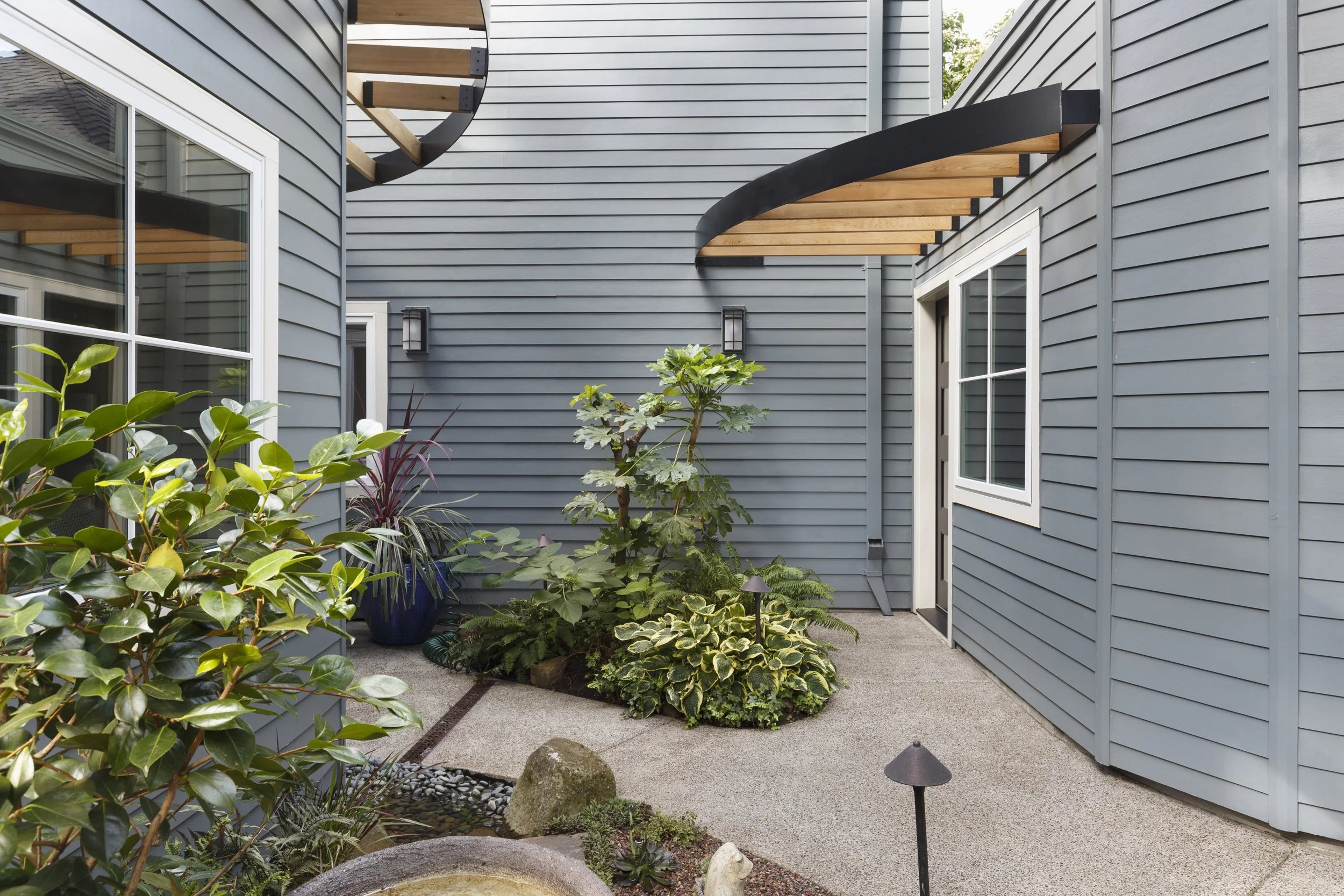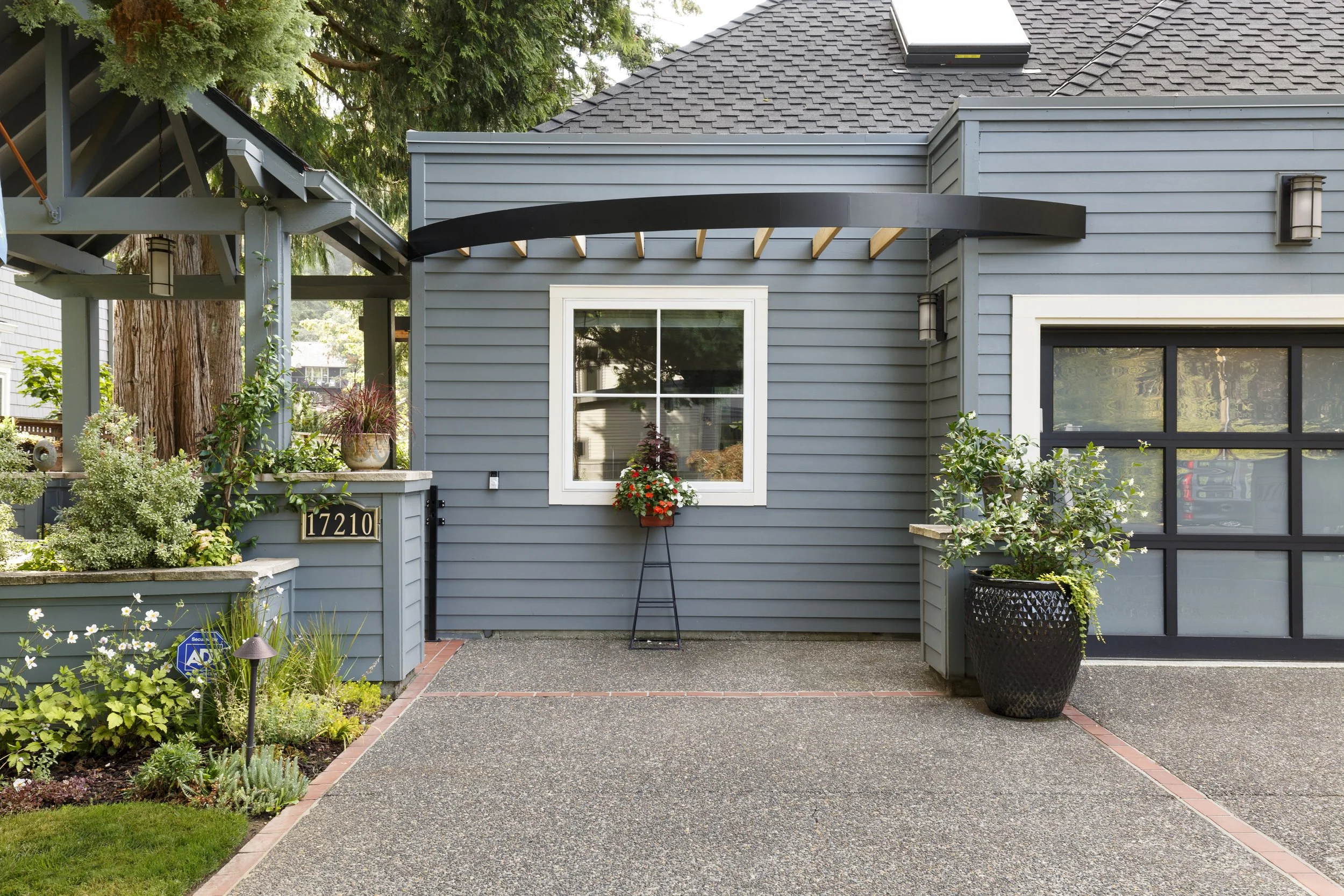 When this couple relocated from California to this 1990’s modern home on a canal in Lake Oswego, they wanted to create a unique space for hosting friends and guests. They hired Gusto to redesign a portion of their three-car garage into a guest suite and party room. The existing curved wall offered the perfect backdrop for a 15-foot-long custom bench with storage below. The tall, vaulted ceilings allowed space for a lofted sleeping area over the ceiling of the bathroom, accessed by a custom steel ladder. The kitchenette includes all the amenities needed for a comfortable short-term stay.