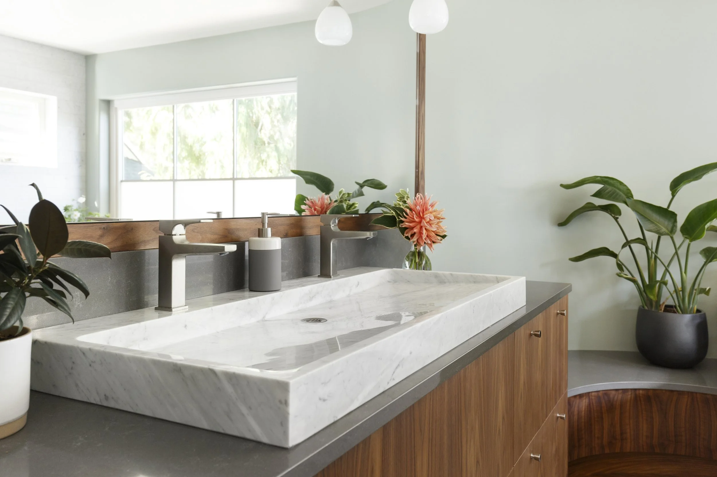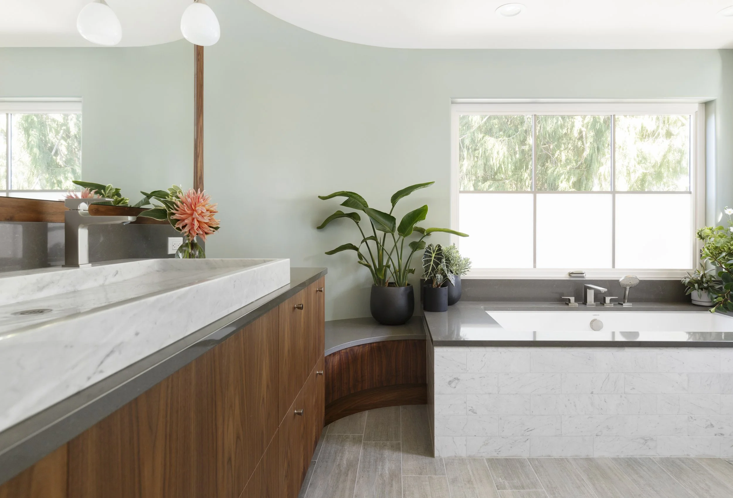 The second phase of work included building out over the existing living room bay to create a new ensuite bathroom with walk-in shower, soaking tub and custom double vanity. The spa-like colors and materials keep this space feeling light, bright and airy.