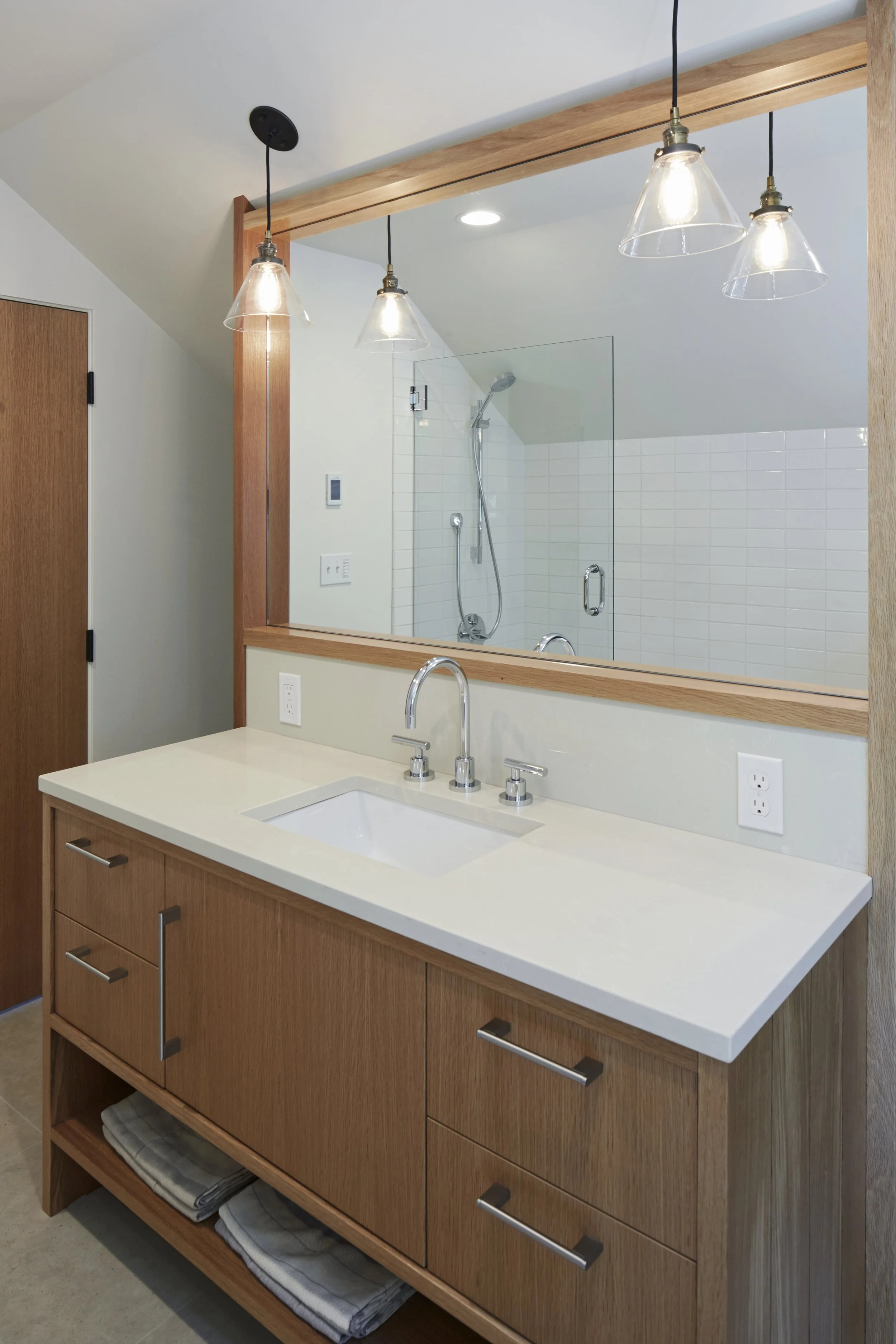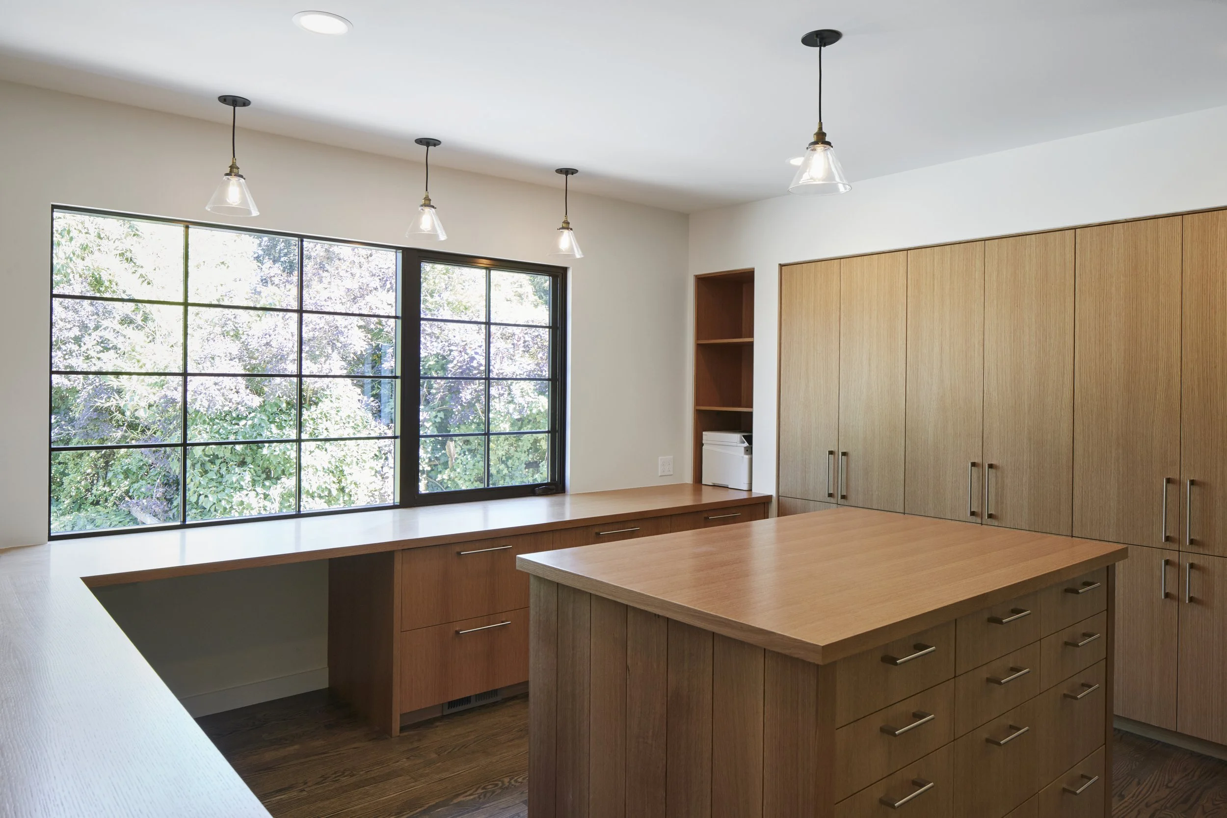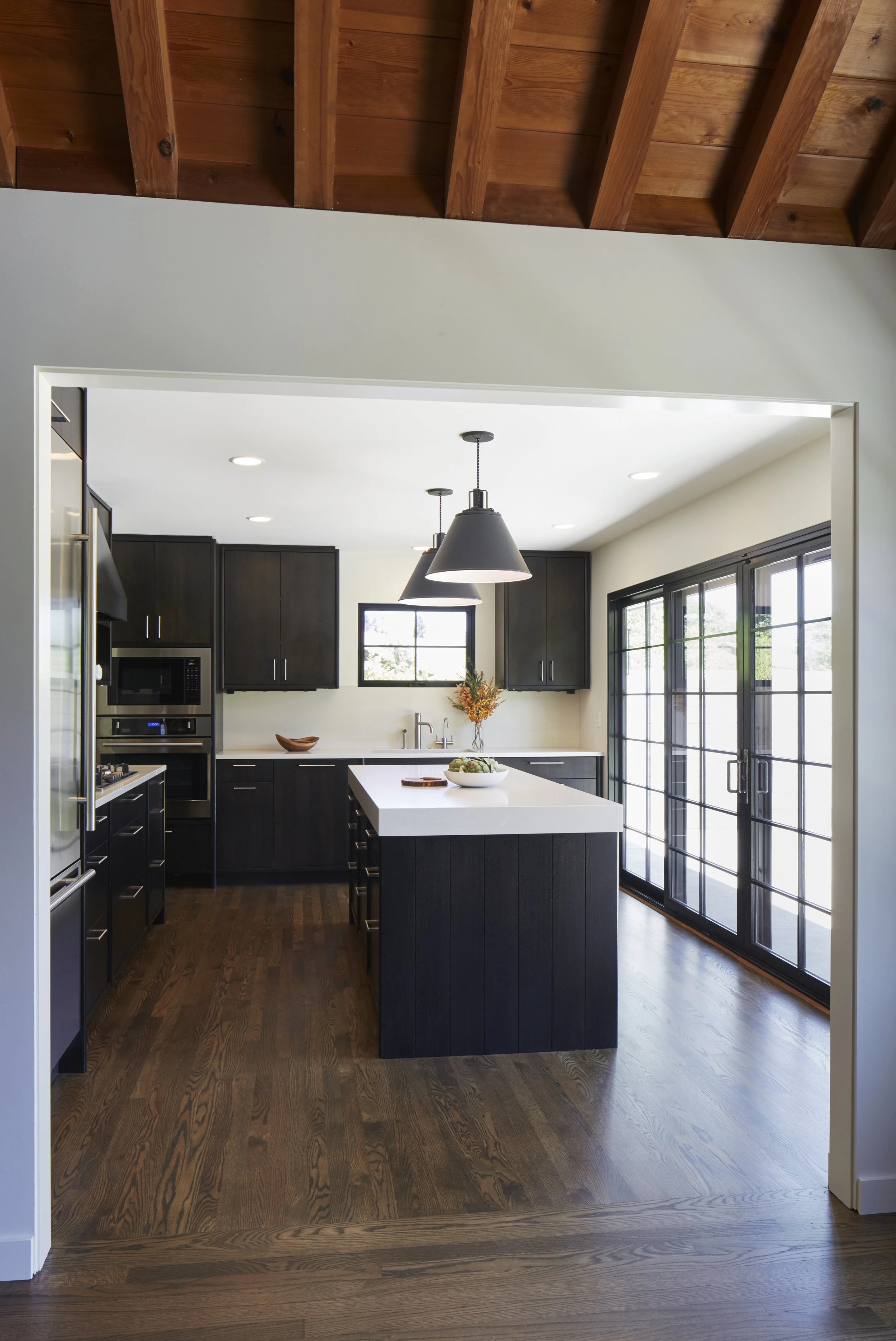 We revived and transformed this 1950’s Wade Pipes home after major water damage. The kitchen was moved to the brighter side of the house and added a large slider to connect to the new patio and garden. We upgraded the original steel sash windows with eco-friendly ones that kept the charm and style. The steel sliding doors were rescued and re-purposed as room dividers and a shower glass panel. The result is a house that honors the original vision and design while opening up the outdoors.